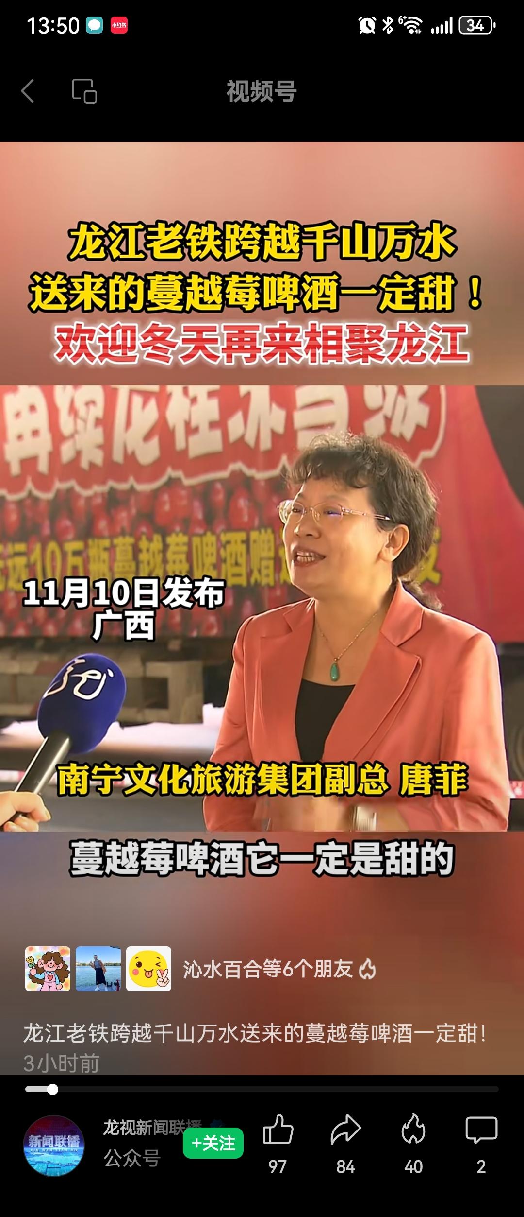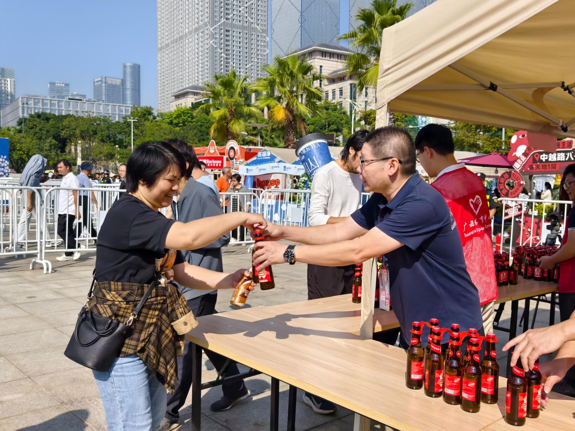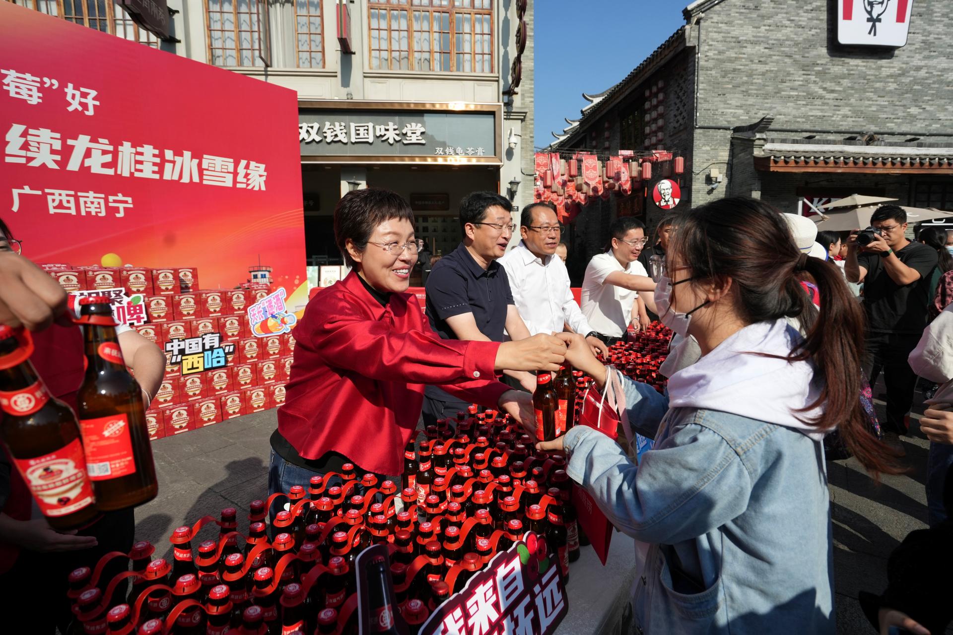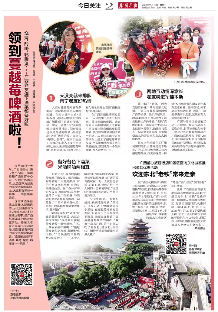 本次活动黑龙江安排了具有特色风味的蔓越莓啤酒在南宁文旅集团旗下文旅项目发放,南宁文旅集团通过迅速整合集团内资源,结合各项目公司自身优势开展定制活动,以蔓越莓啤酒发放活动再造“南北CP”文旅新热点。11月10日当天,邕州古城·三街两巷与广西体育中心的活动现场人头攒动,市民们热情高涨,有序排队,只为亲手接过这份来自远方的醇香礼物。这场跨越千里的文化盛宴,在广西南宁绚烂上演,不仅为南宁市民的味蕾带来了惊喜,更开启了佳木斯与南宁两地文化旅游深度交流合作的第二篇章。