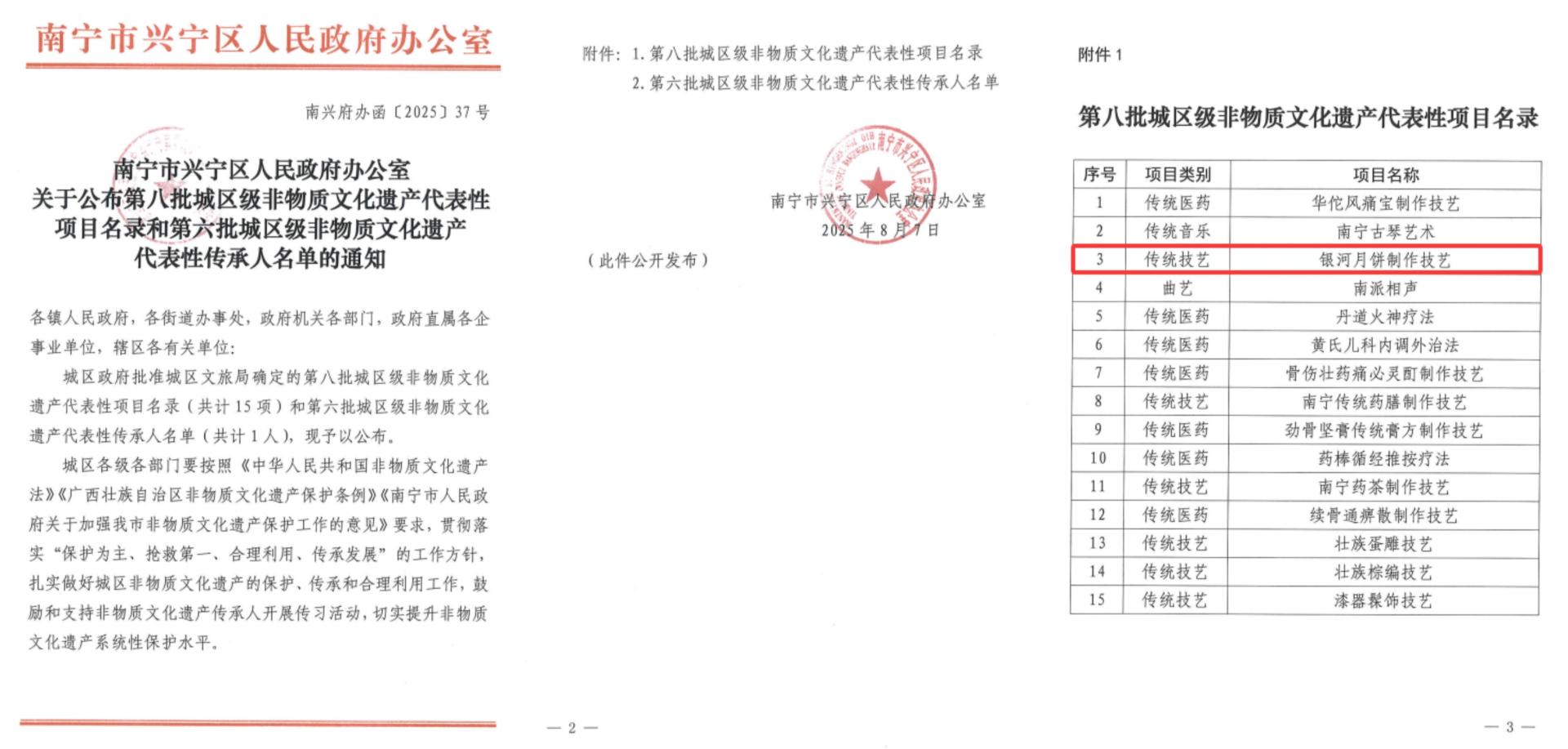 匠心传承,文脉赓续;文化根脉,再谱新篇。近日,南宁文旅集团旗下银河公司 “银河月饼制作技艺” 正式入选南宁市兴宁区第八批非物质文化遗产代表性项目名录。此前,银河公司已获自治区级非物质文化遗产代表性项目 “南宁老友粉” 传承基地称号,其 “邕城凉茶制作技艺” 亦入选南宁市级非物质文化遗产代表性项目。此次入选,是银河公司在本土传统技艺挖掘、保护与活化利用领域的又一重要成果,标志着企业品牌文化底蕴与核心竞争力的持续提升。