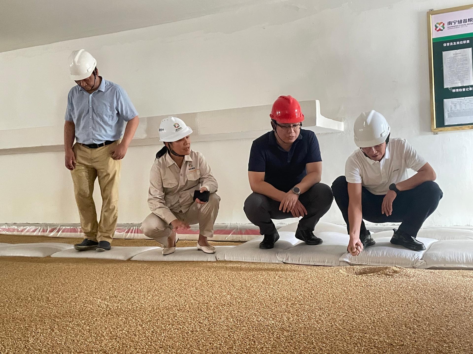 刘桂发一行先后深入储备粮公司五象粮库原粮仓、成品仓以及大米加工生产车间开展调研,实地查看原粮、成品粮存储环境,详细了解储备粮温湿调控、轮换出库等工作细节。同时,还现场观摩了稻谷清理、脱壳、碾米等全流程生产环节,了解加工生产设备运行、产品质量管控等情况,并就企业在原粮保管、应急成品粮轮换管理面临的问题和困难进行深入交流。