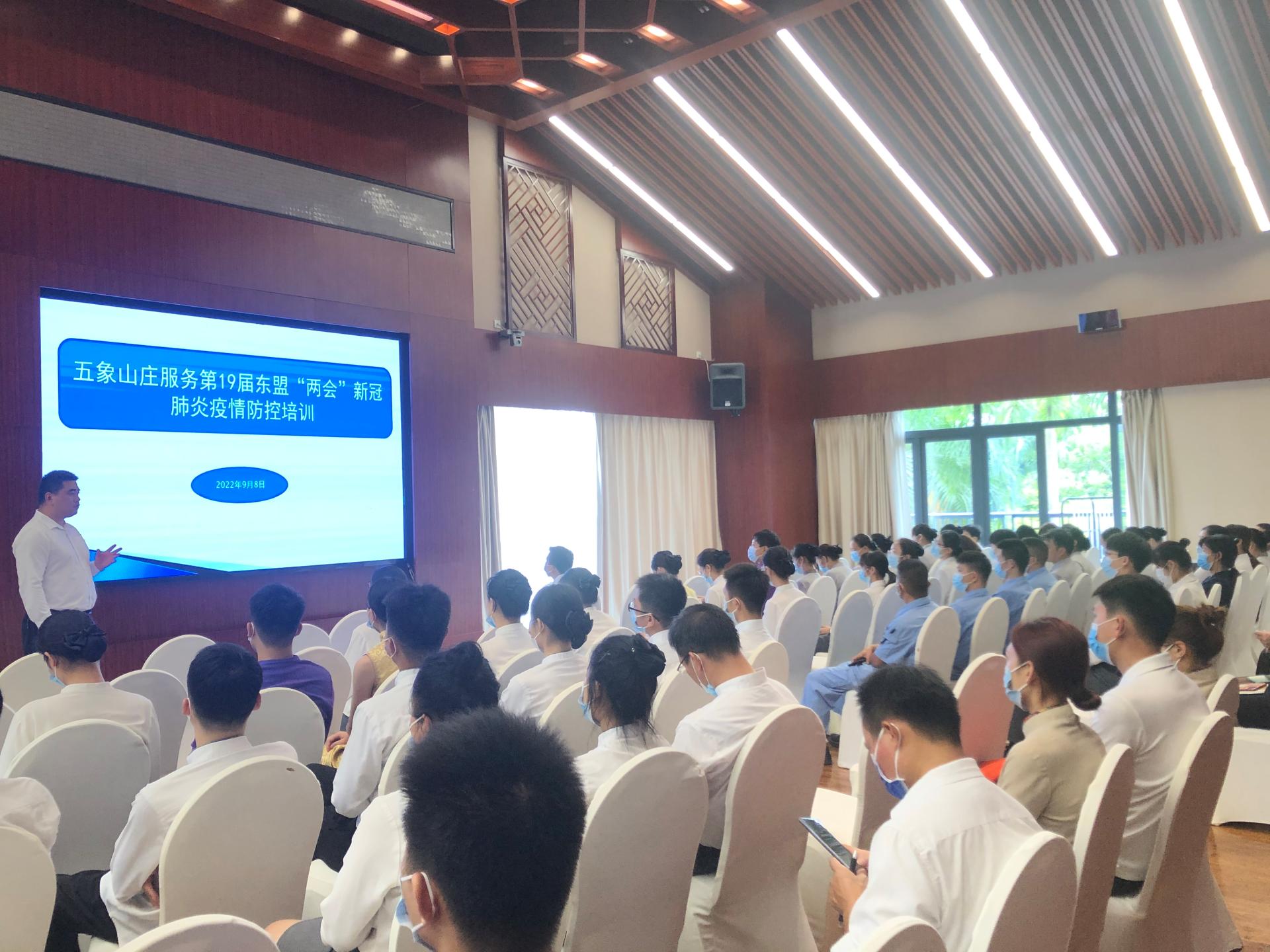 根据疫情防控政策,五象山庄明确会前、会议期间防疫要求,严格落实公共区域、酒店客房、餐具器皿消毒清洁工作,并组织全体员工开展疫情防控培训及应急程序处置演练。东博会服务接待期间,细化防疫措施,实行全员核酸检测“每日一检”要求,对所有进入酒店的人员一律严查72小时核酸阴性码及健康码、行程码和测量体温等,并为到店宾客提供口罩、免洗消毒液等防疫物资,确保贵宾顺利参会。