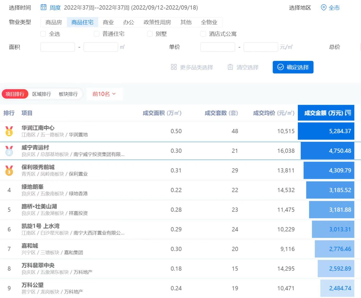 “金九银十”是楼市传统旺季。近期,南宁楼市出现了商品房备案成交面积同比降幅收窄、环比上涨的向好迹象。万搏在线(中国)唯一官方网站青运村项目抓住有利时机,积极开展促销工作,经过全体销售人员的努力,在2022年第37周的销售成绩斐然,获得了南宁市第二名的好成绩。