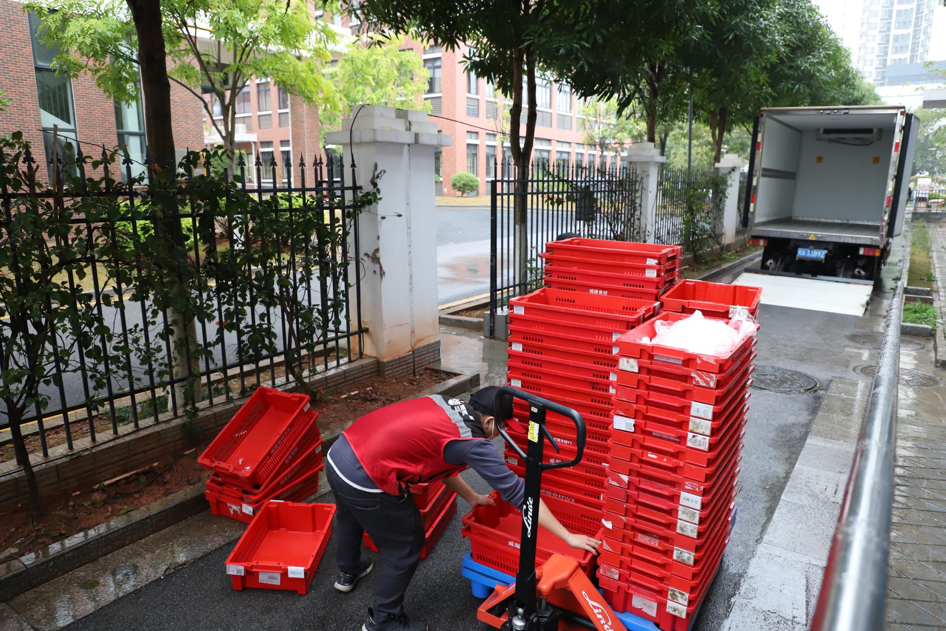 配送结束,配送员将分拣框回收装车,运回基地清洁