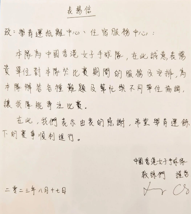 “本队为中国香港女子手球队,在此诚意表扬贵单位对本队于比赛期间的服务及安排……”8月17日,第一届全国学生(青年)运动会运动员村村民委员会(以下简称:村委会)收到一封来自中国香港女子手球队的表扬信,信中特别感谢了村委会抵离与访客中心、住宿服务中心在女子组手球比赛期间,以周到的服务解决了团队成员遇到的困难,为其专注赛事提供了有力保障。