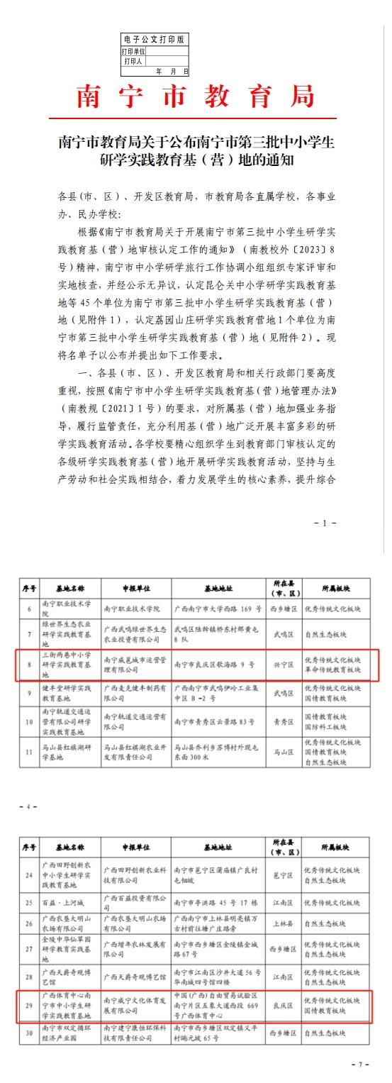 近日,南宁市教育局印发《南宁市教育局关于南宁市第三批中小学生研学实践教育基(营)地名单的公示》(南教示〔2023〕11号),正式公布南宁市第三批中小学生研学实践教育基地名单,威邕城市运营集团下属项目老南宁·三街两巷与广西体育中心获批成为“南宁市第三批中小学生研学实践教育基地”。