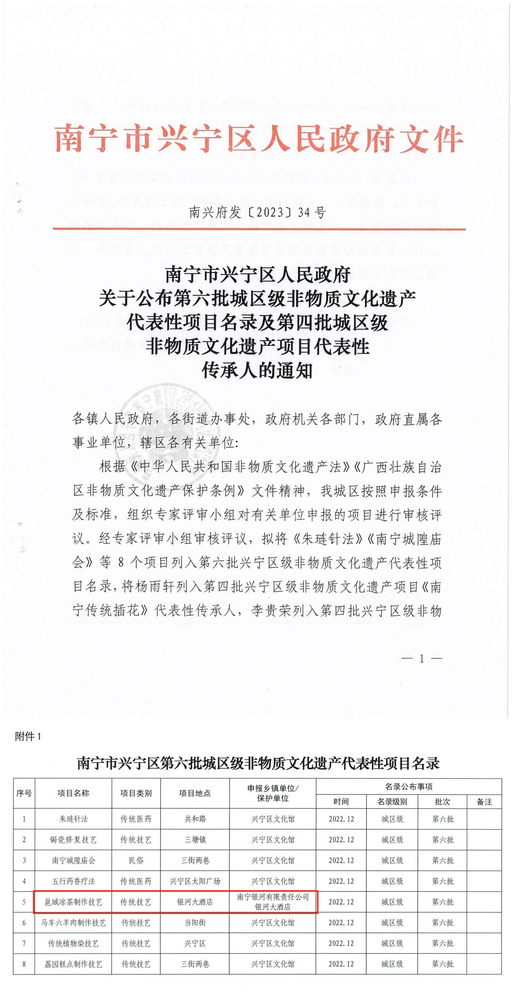 近日,南宁市兴宁区人民政府公布《第六批城区级非物质文化遗产代表性项目名录及第四批城区级非物质文化遗产项目代表性传承人的通知》文件,南宁银河大酒店“邕城凉茶制作技艺”成功入选第六批兴宁区非物质文化遗产代表性项目名录,这也代表着邕城凉茶文化迈向新的发展台阶。