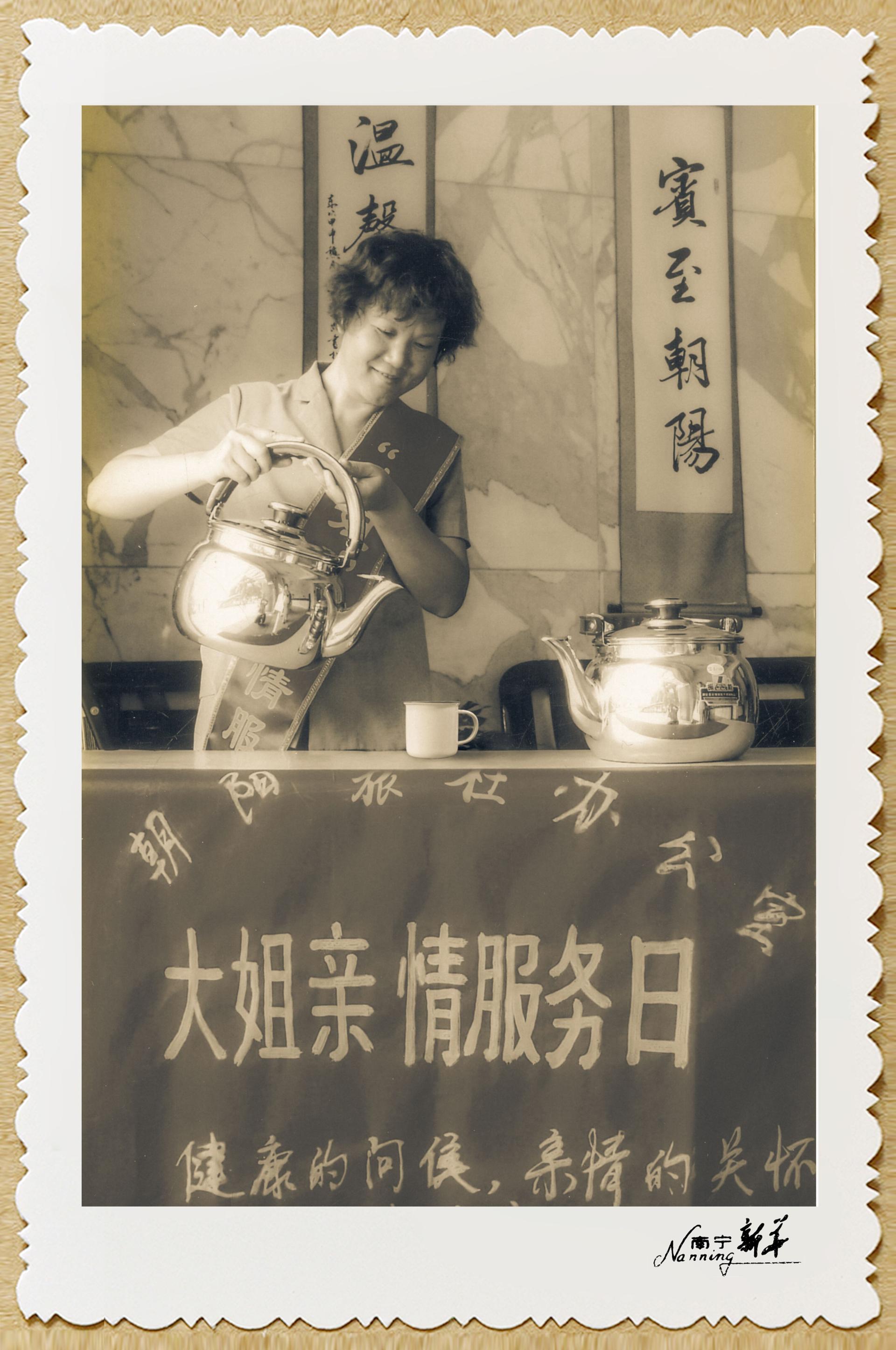 1993年,工作人员在大堂为客人提供消暑凉茶