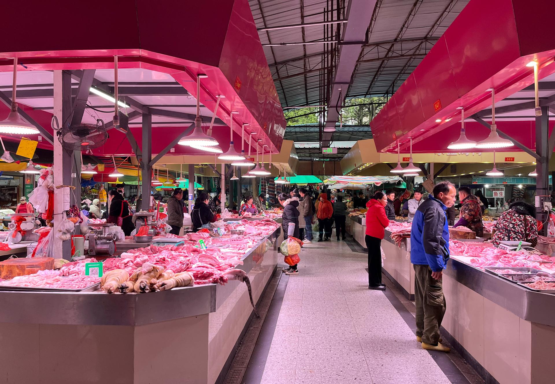 在南宁市交易场、那元果菜市场等农贸市场,近500种新鲜蔬菜、米面粮油、各色水果、干货及各类生活用品摆放整齐、琳琅满目、应有尽有,生鲜区内猪肉、禽类、水产品等种类丰富、供应充足,市民群众在各摊位前络绎不绝挑选和购买所需菜品。