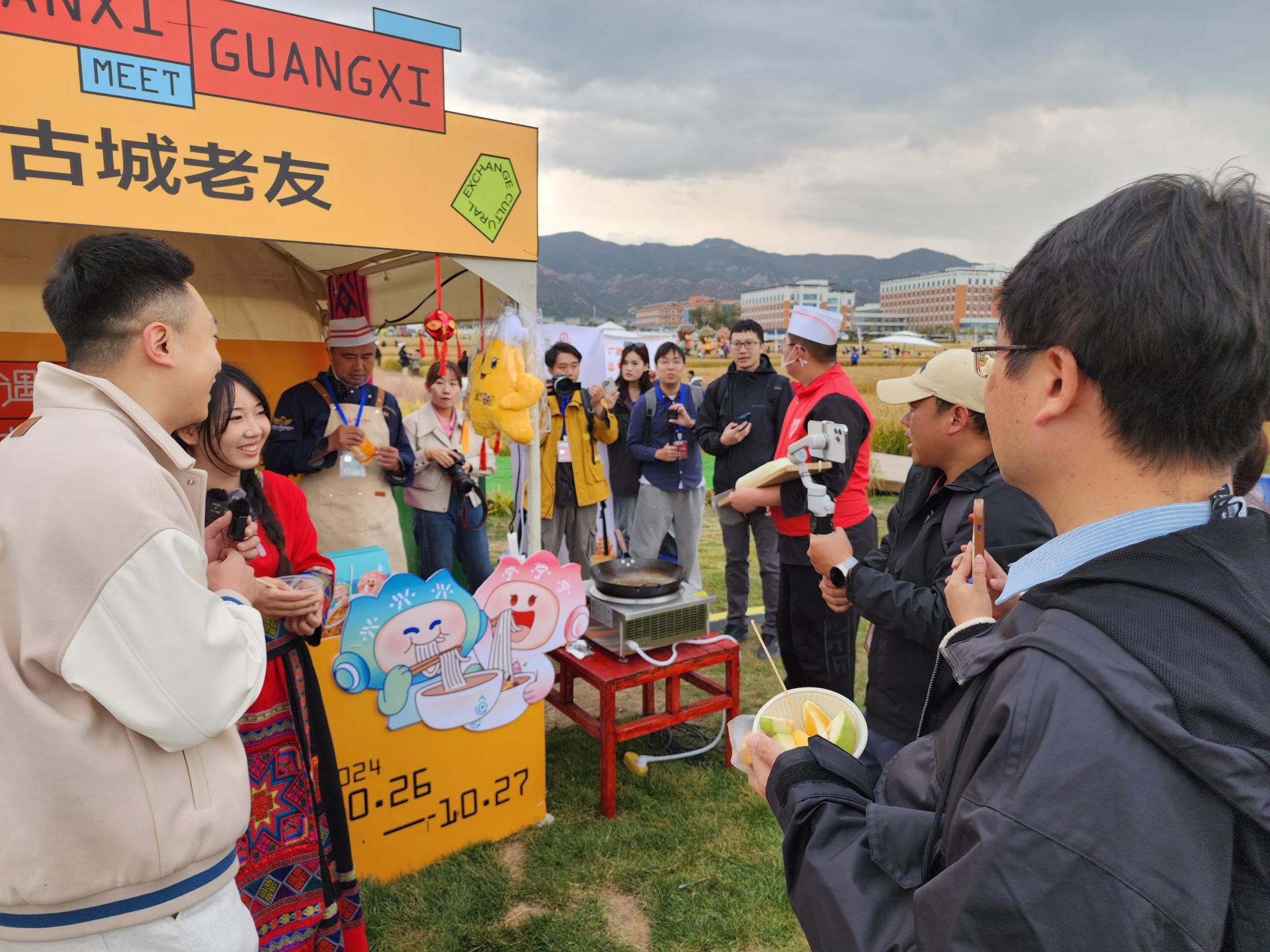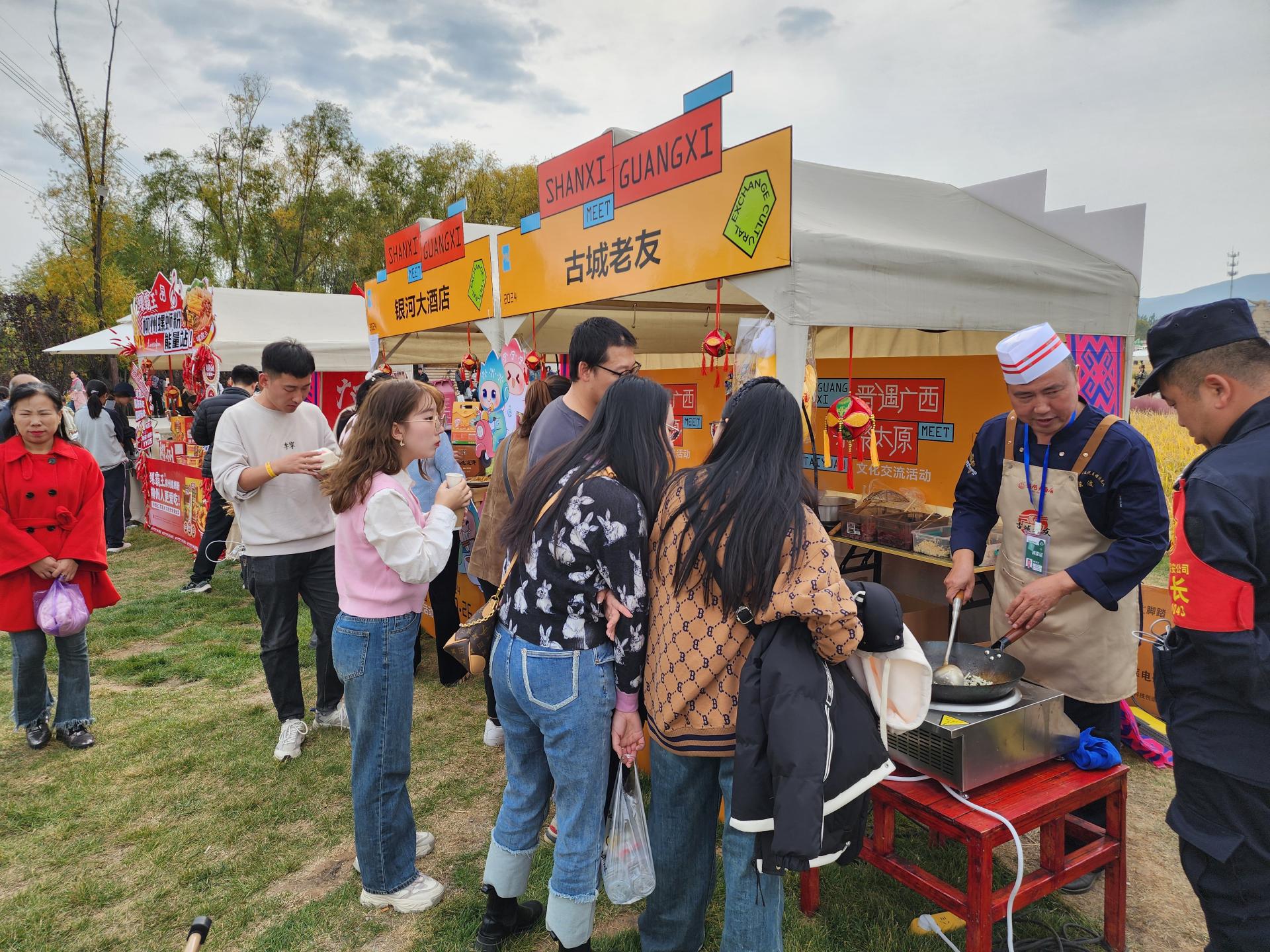 在现场金黄的麦田边上,银河大酒店设立“古城老友”展台,南宁老友粉市级代表性传承人——陈波支起炉灶,为现场市民带来一场“当南宁老友味道遇上山西面食”的美食文化“联姻”技艺展示,炒锅有节奏地翻动,散发出浓浓的香气,引得过往市民纷纷驻足。“这是我们的‘老友面’,别具特色的南宁老友食材在烟火的爆炒下,与山西面食融合,完美突出了两地美食的特点”陈波边烹饪边向市民介绍道。此次银河大酒店创新推出“老友味道与山西面食碰撞”产品,为两地美食文化融合做了大胆尝试,获得了活动现场食客的追捧。