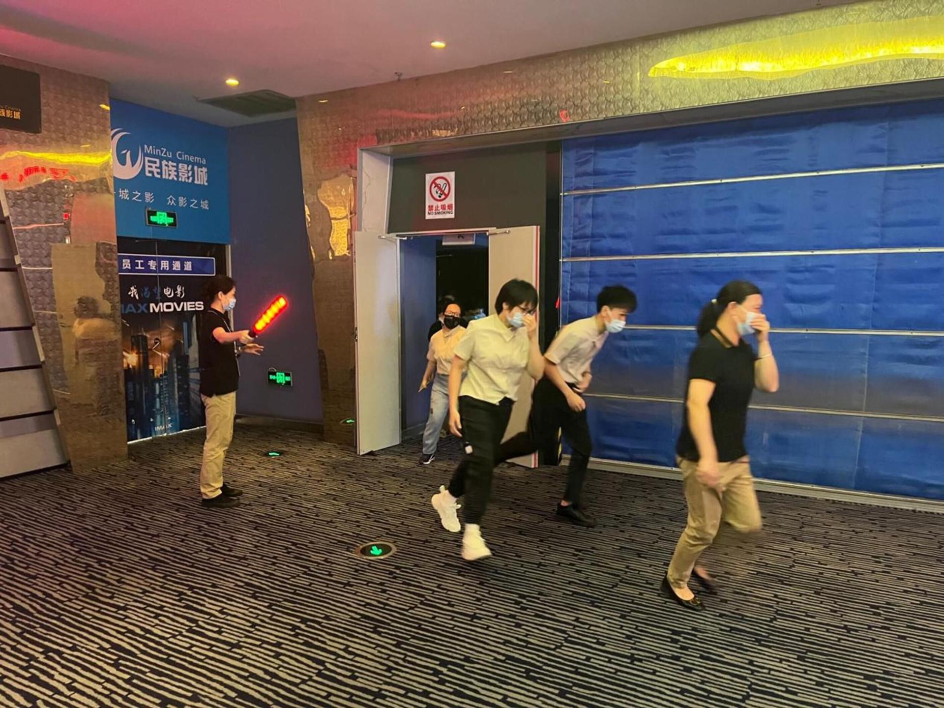上午9时,民族影城5号影厅内的观众正在兴趣勃勃地观看电影,接着传来5号厅内发生“火情”,现场利用仿生模拟道具造出烟雾后,厅内警铃大作,播出紧急疏散观众的通知。同时,影厅工作人员迅速来到厅内,告诉观众影厅内发生“火情”,引导大家弯着腰,捂住口鼻,屏住呼吸,沿着指示标志的指向外走。在现场服务员的引导下,观众们有序朝影厅外撤离疏散,随后民族影城消防志愿队成员也已经赶到起火现场,迅速打开厅内消火栓水龙头灭火,火势很快便得到控制并逐渐熄灭。