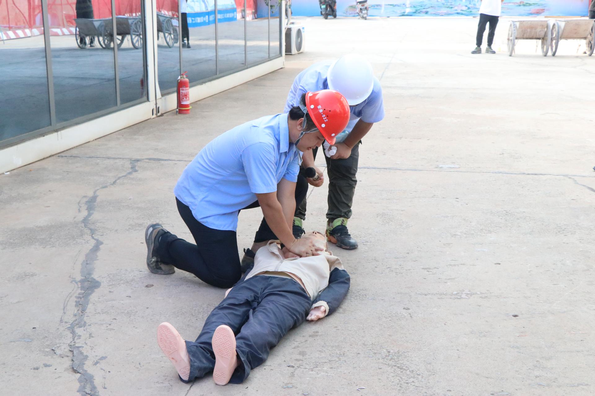 演练中,专业讲解员从灭火器、消防栓使用方法及维护检查等方面进行了全方位讲解,并以实操演示的方式,讲解了人员受伤后的应急处置方式以及心脏复苏急救过程。讲解结束后,参会人员积极参与实操环节,现场氛围十分活跃。