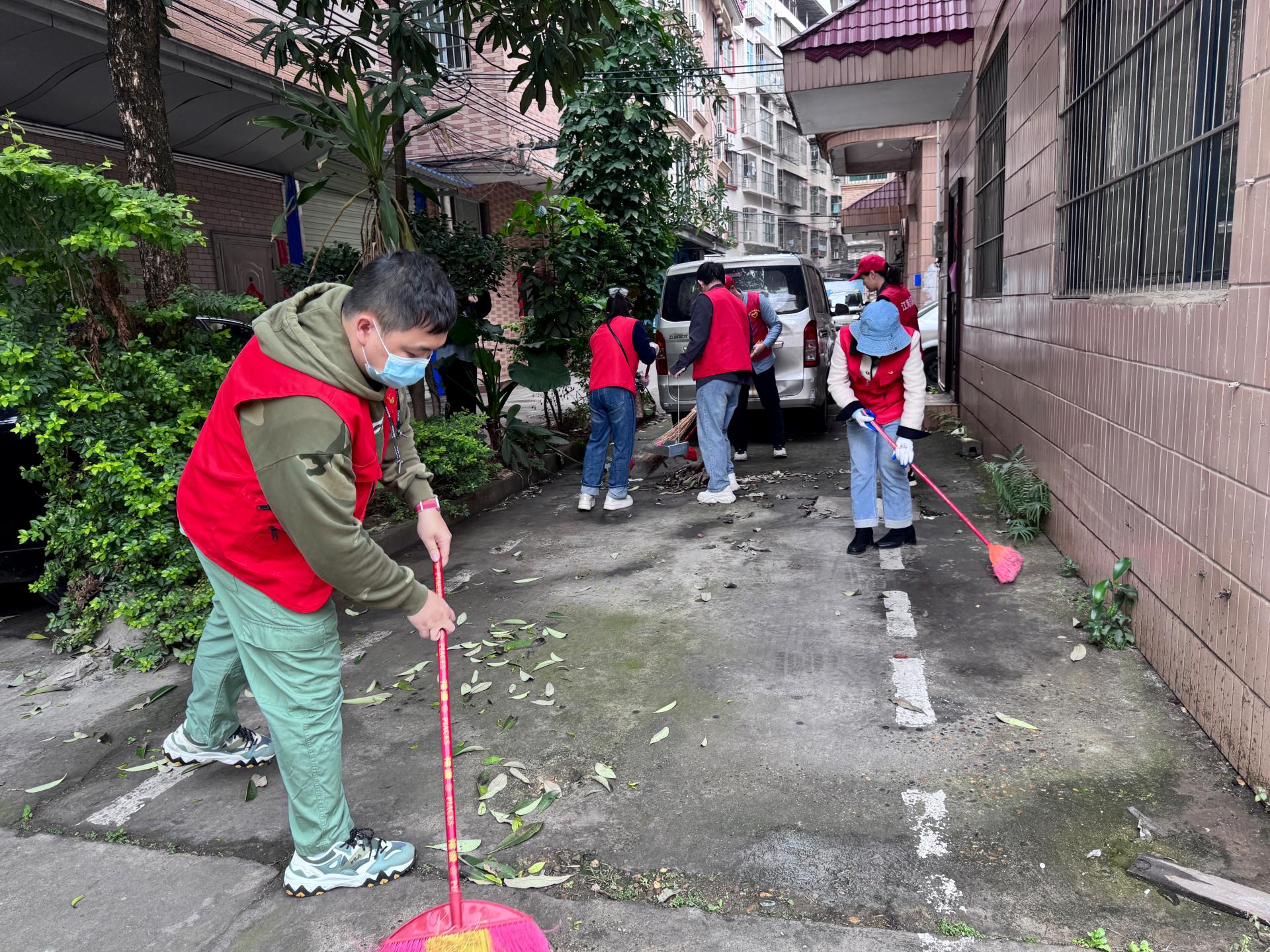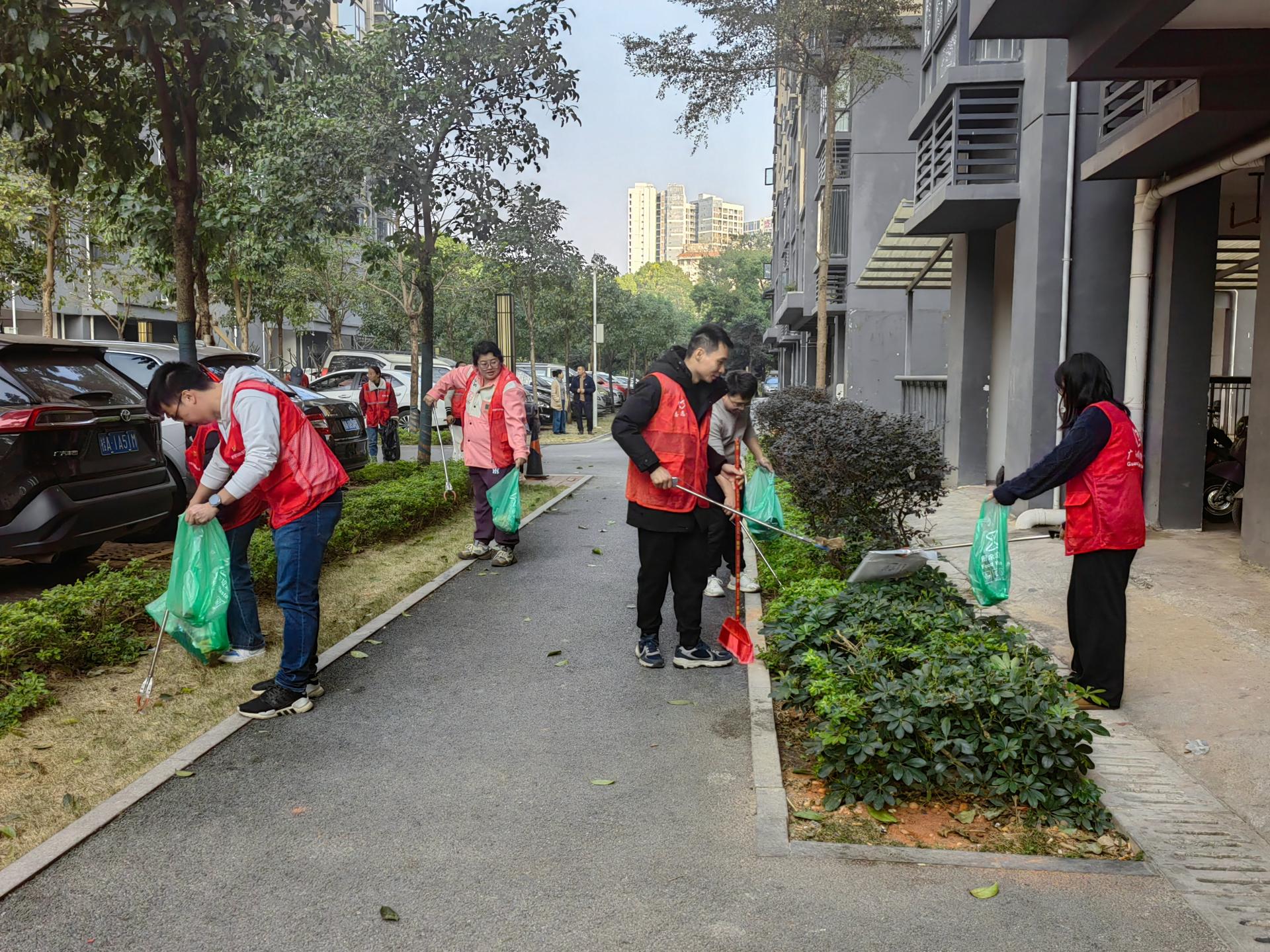 在江南南国花园商城、二七二地质队小区、苏州路南铁北一区等老旧小区,公区街道的环境卫生一直是个困扰居民的问题。在社区负责人的带领下,党员志愿者手持扫把、垃圾铲和夹钳等工具,动作麻利、默契配合地投入环境清扫工作,劳动中的红色马甲成为传递温暖与善意的流动风景。