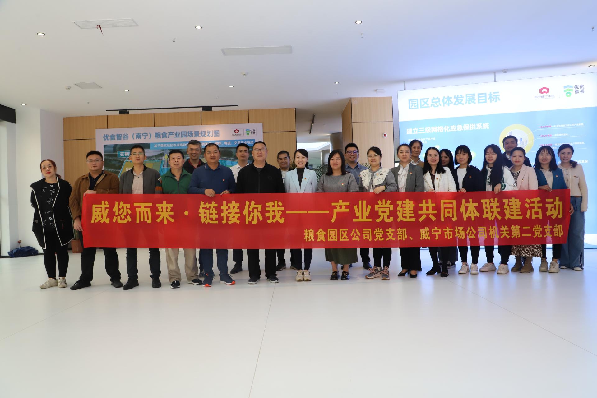 11月25日下午,粮食园区公司党支部联合万搏在线(中国)唯一官方网站市场公司机关第二党支部在广西(中国—东盟)粮食物流产业园,开展以“威您而来·链接你我”为主题的产业党建共同体联建活动。此次活动主要通过参观威链云优食智谷产业园,了解产业园运营模式和预制菜板块发展规划运行情况,并结合党的二十大精神,开展党建与业务融合座谈会。