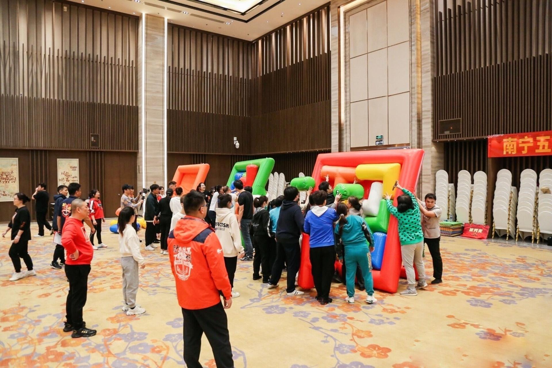 基业长青、飞盘嘉年华、俄罗斯方块、使命必达……近日,在五象山庄11号楼大宴会厅,一场以“团结奋斗,超越期望”为主题的团建活动现场如火如荼,五象山庄公司共160多名职工踊跃参与。