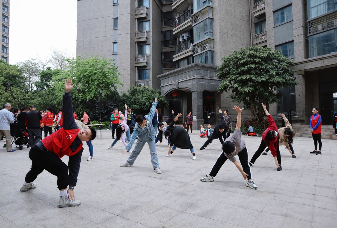 健身教练示范传授社区居民健身动作
