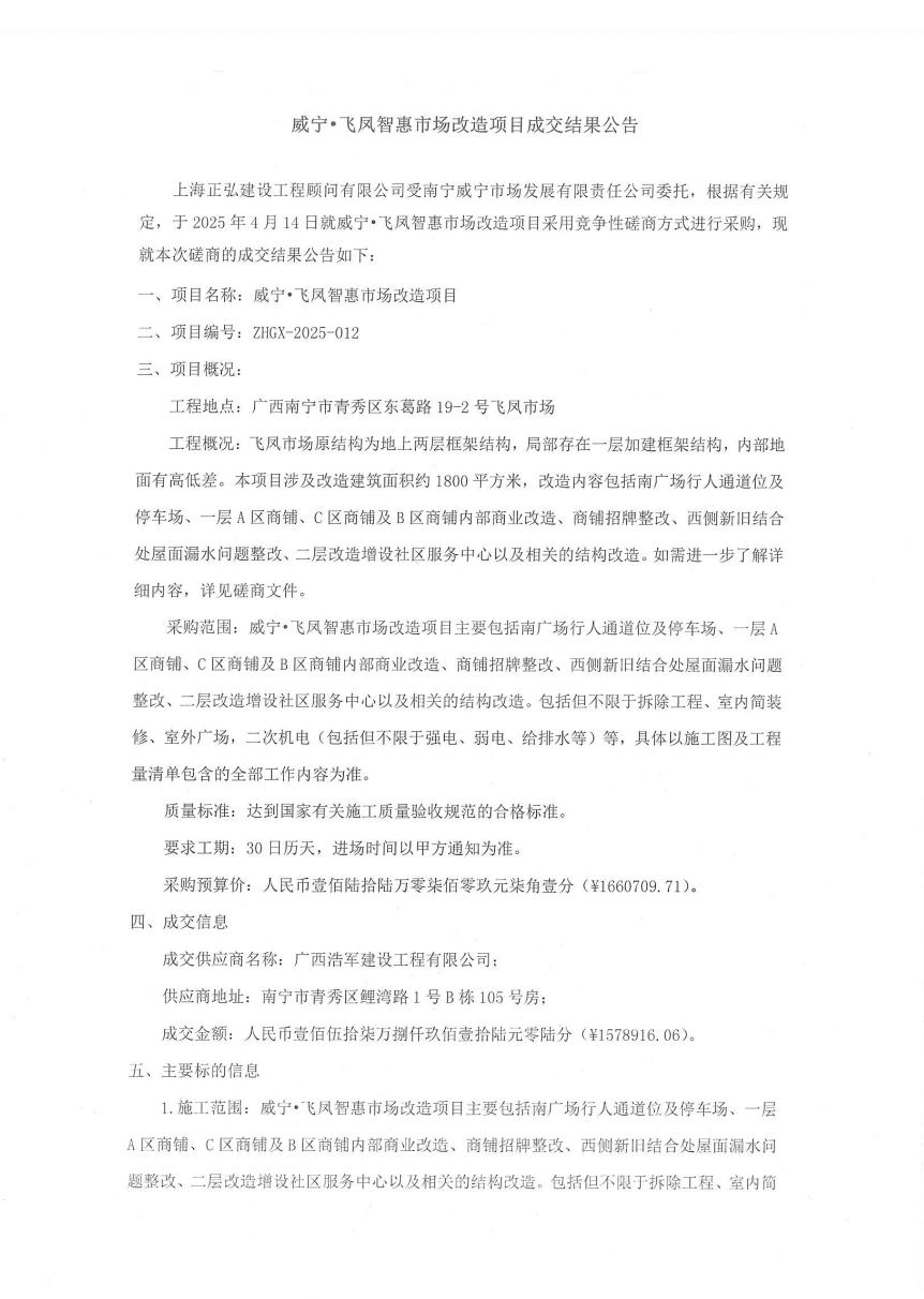 万搏在线(中国)唯一官方网站·飞凤智惠市场改造项目成交结果公告