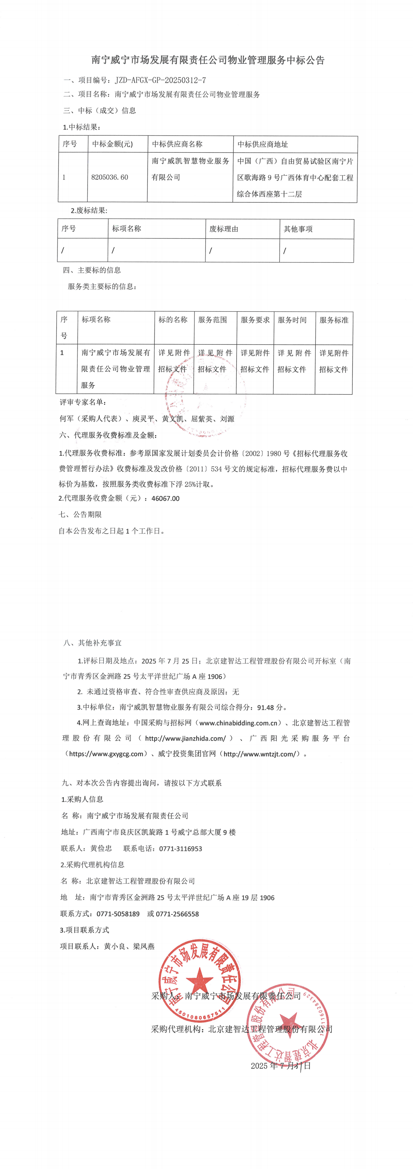 南宁万搏在线(中国)唯一官方网站市场发展有限责任公司物业管理服务中标公告
