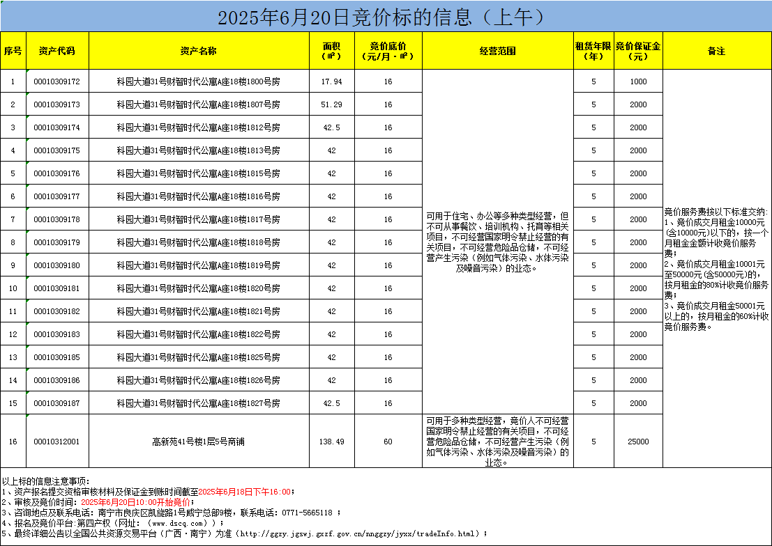 2025年6月20日竞价标的信息(线上竞价)