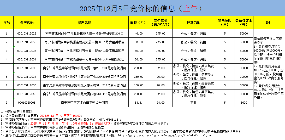 2025年12月5日竞价标的信息(现场竞价)