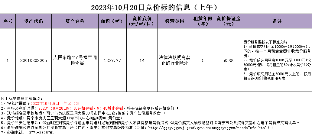 2023年10月20日竞价标的信息