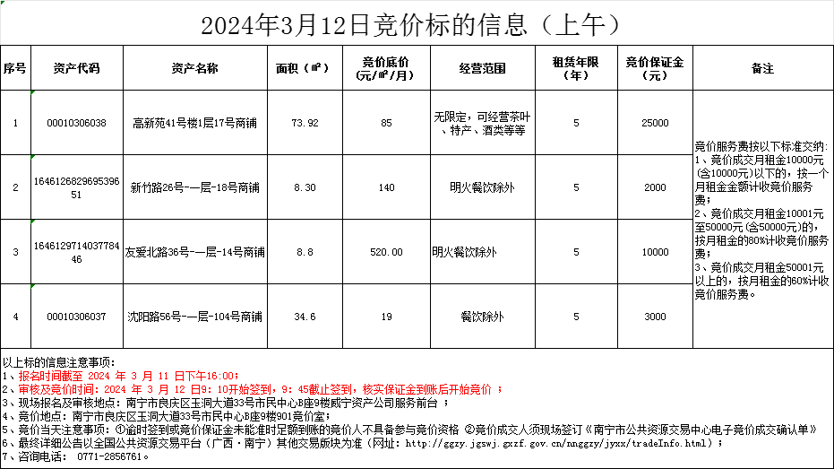 2024年3月12日竞价标的信息(现场竞价)