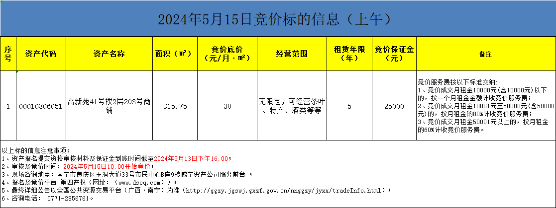 2024年5月15日竞价标的信息(线上竞价)