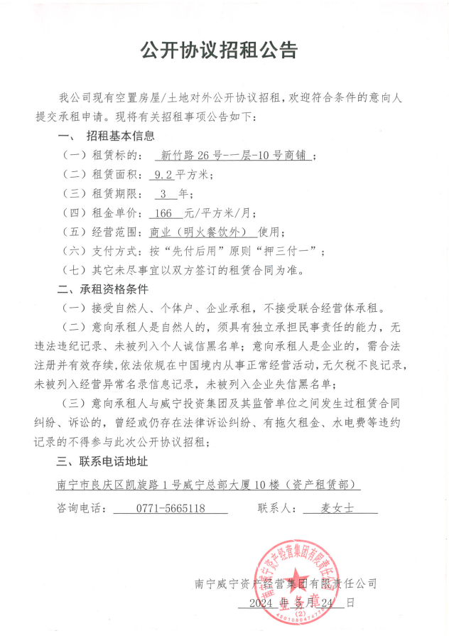 新竹路26号一层10号商铺公开协议招租公告