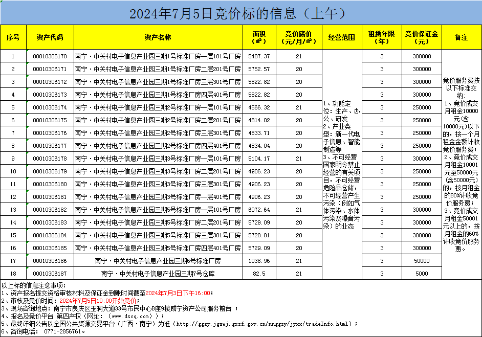 2024年7月5日竞价标的信息(线上竞价)