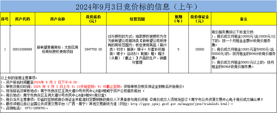 2024年9月3日竞价标的信息(现场竞价)