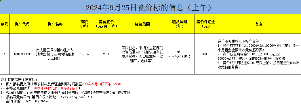 2024年9月25日竞价标的信息(线上竞价)