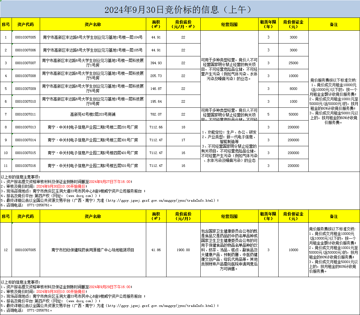 2024年9月30日竞价标的信息(线上竞价)