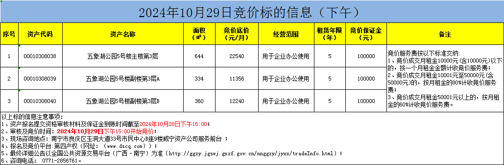 2024年10月29日竞价标的信息(现场竞价)
