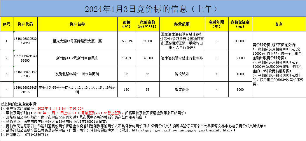 2025年1月3日竞价标的信息(现场竞价)
