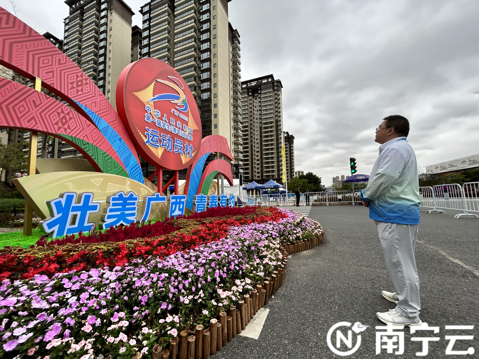 然而,氛围营造整活儿并不如表面上看到的那么欢乐。对叶庆来说,给运动员村进行氛围设计、布置是个新的挑战,学青会的举办时间、广西的季节天气(台风)等让他感到棘手。大到五六吨重的设备,小到一枚防撞贴,他需要考虑到方方面面。每天,叶庆都会巡村3次,观察可能发生的情况。