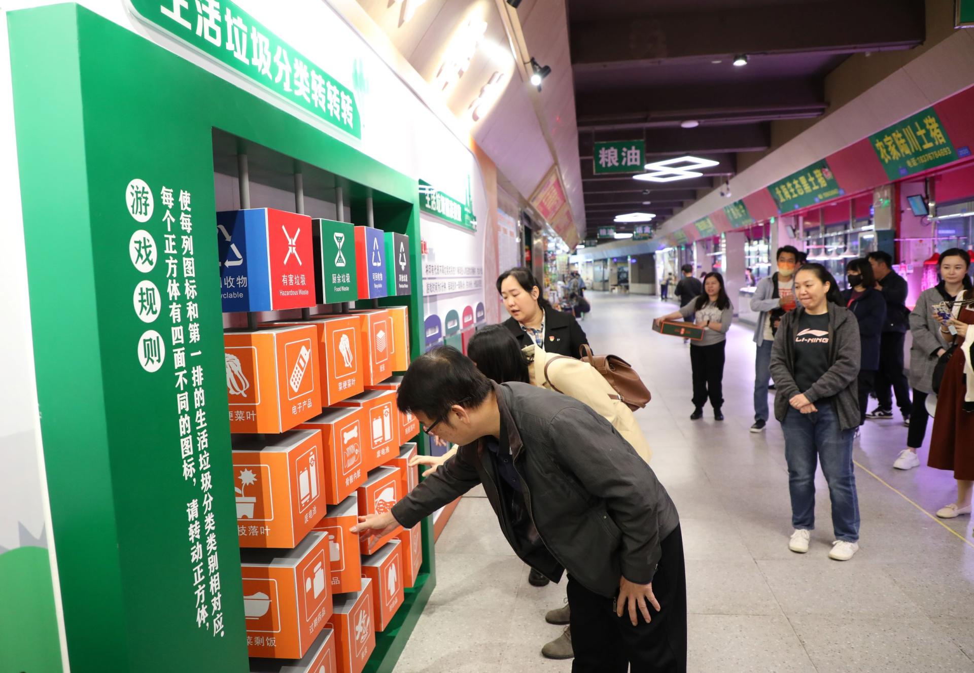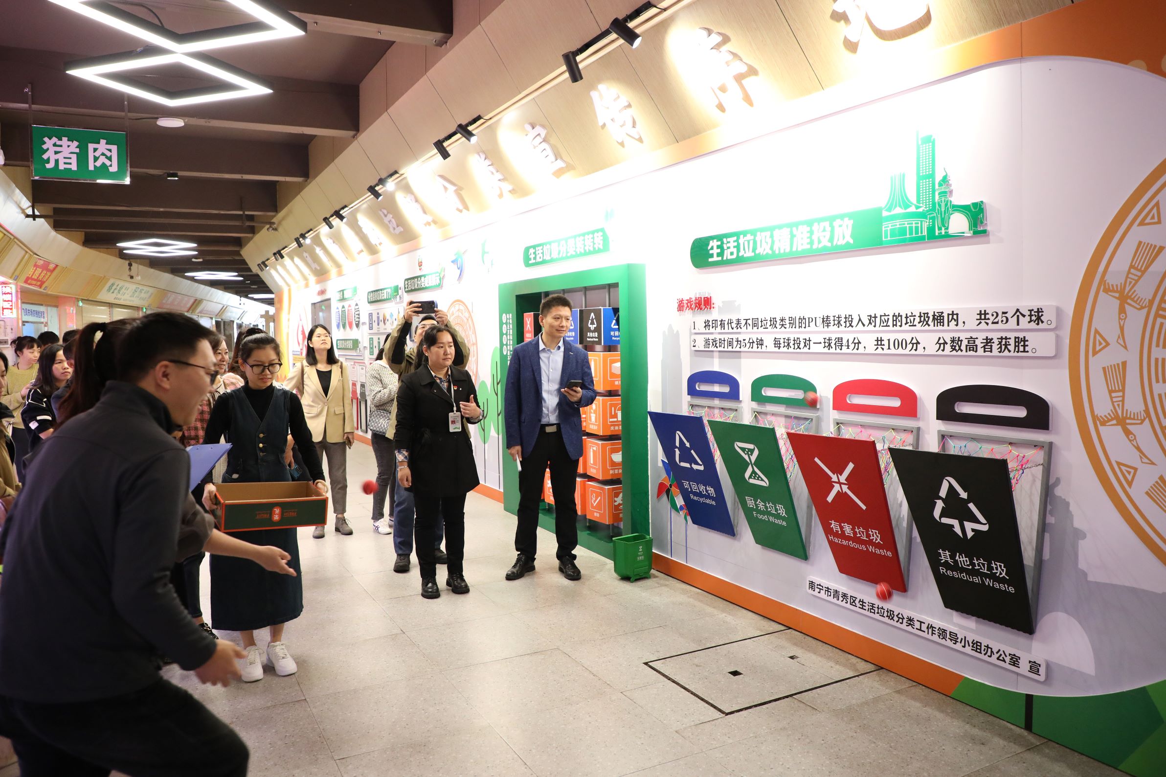 据悉,南宁市飞凤市场生活垃圾分类宣传教育阵地总长25米,分为理论学习、经验介绍、投放指引、源头处理及趣味游戏等板块,参观者可以通过系统了解农贸市场生活垃圾分类工作要求、观看以飞凤市场为蓝本的南宁市农贸市场生活垃圾分类宣传教育动画、听取“飞凤经验”成果介绍、沉浸式模拟农贸市场生活垃圾投放及参与趣味小游戏等方式,进一步养成良好的分类意识,自觉参与生活垃圾分类,共建共享绿色、低碳、文明的社会环境。