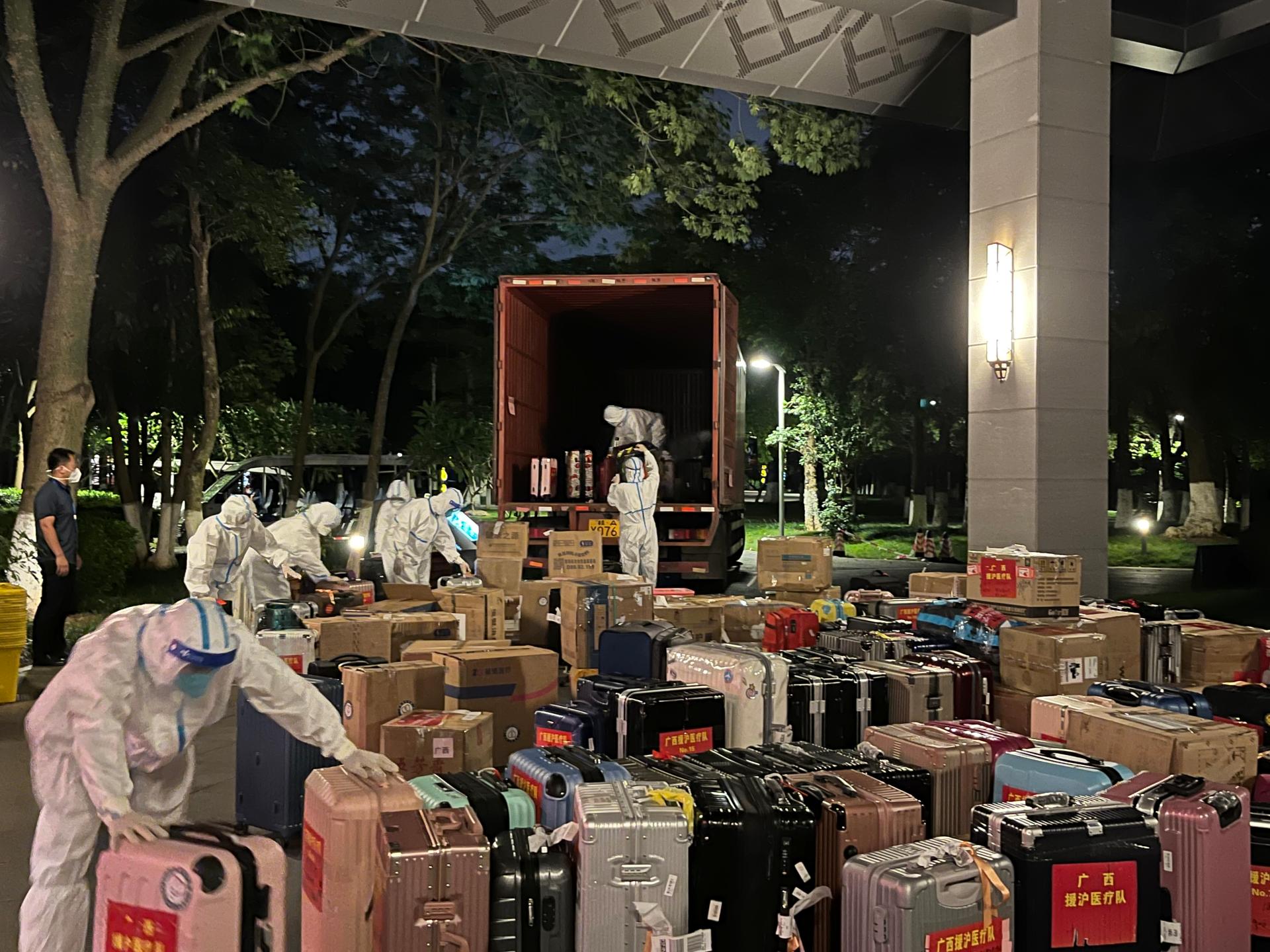 前厅部全副武装为抗疫休整团队搬运行李