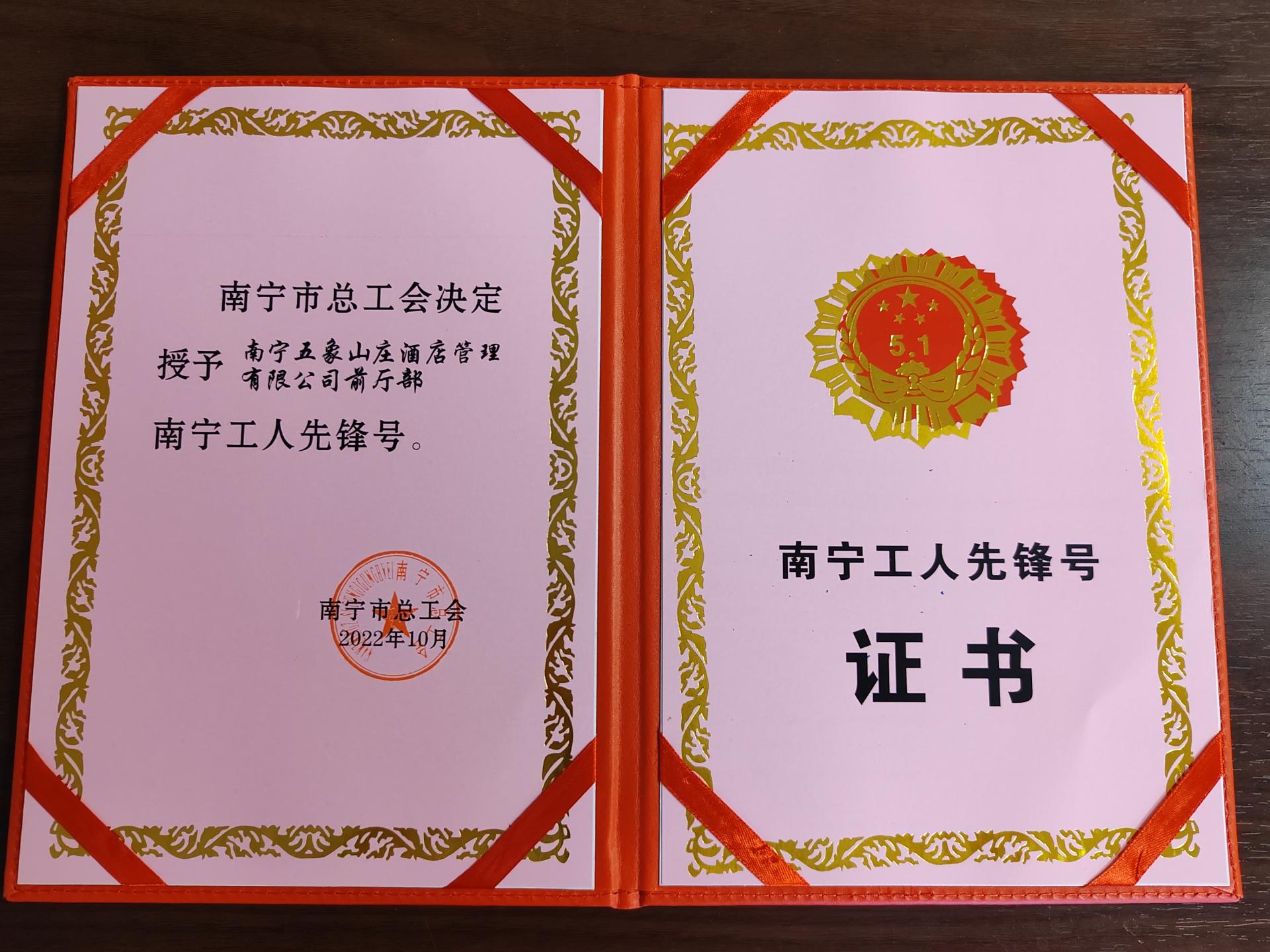 2022年南宁市“工人先锋号”获奖证书