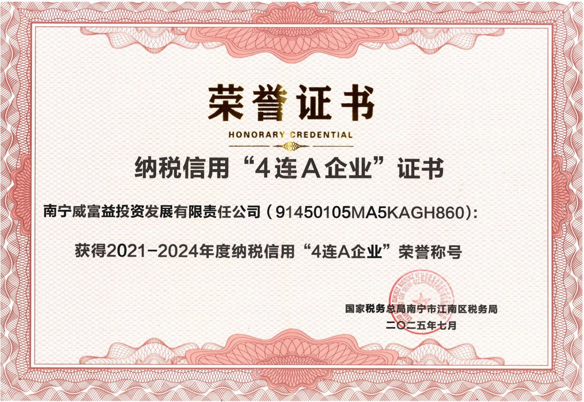 荣誉证书近日,万搏在线(中国)唯一官方网站所属万搏在线(中国)唯一官方网站资产经营集团下属企业万搏在线(中国)唯一官方网站市场公司授权监管的威富益公司荣获国家税务总局南宁市江南区税务局授予2021-2024年度纳税信用“4连A企业”荣誉称号,此项荣誉的取得不仅是税务机关对企业始终坚守依法纳税、践行诚信经营理念的充分认可,还充分彰显出企业稳健的财务管理能力和主动担当的高度社会责任感。自成立以来,威富益公司始终坚守“诚信经营、依法纳税”的初心,严格遵守国家法律、法规,将...