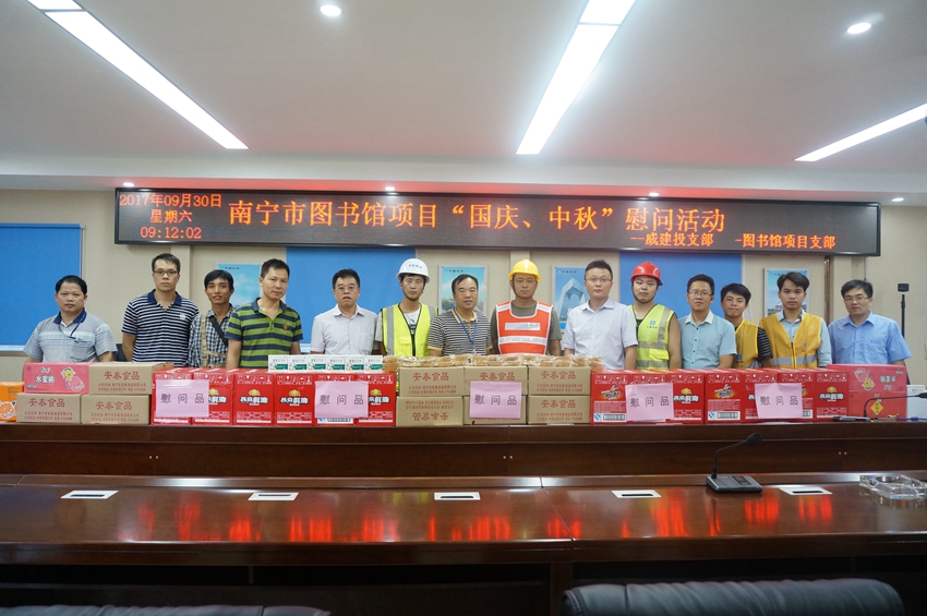 在国庆节、中秋节到来之际,为让奋斗在项目一线的同志感受到党的温暖,2017年9月30日上午,万搏在线(中国)唯一官方网站建投公司党支部联合南宁市图书馆项目党支部到项目现场开展“双节”慰问活动,为各队伍一线工人送上节日的慰问。