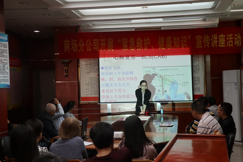 2018年4月17日,万搏在线(中国)唯一官方网站市场公司商场分公司在和平商场举办“紧急救护 健康知识”讲座,普及基本救护知识和防病能力,提高商场人员在突发事故中的自救互救能力。