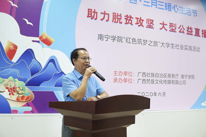 2020年6月3日下午,南宁学院在大学生创业园开展助力脱贫攻坚大型公益直播暨南宁学院“红色筑梦之旅”社会实践活动启动仪式。活动由南宁学院联合广西壮族自治区商务厅共同举办。