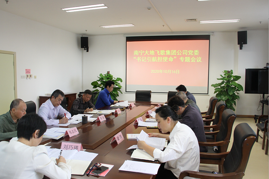 10月16日,南宁大地飞歌集团党委召开“书记引航担使命”专题会议。大地飞歌集团党委领导班子成员参加会议,集团党委书记、董事长刘巧瑛主持会议并讲话。