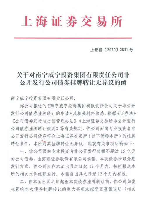 2020年12月17日,集团收到上海证券交易所(以下简称“上交所”)《关于对南宁万搏在线(中国)唯一官方网站投资集团有限责任公司非公开发行公司债券挂牌转让无异议的函》,成功申报15亿元私募公司债发行额度。