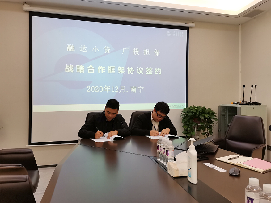 签订战略合作框架协议近日,南宁市融达小额贷款有限责任公司(以下简称“融达小贷公司”)与广西投资集团融资担保有限公司(以下简称“广投担保公司”)签订战略合作协议,首批合作开展项目达8200万元,此次签约是融达小贷公司坚持党建与业务发展深度融合,以党建促发展,引领和推动公司经营工作发展的一大举措。融达小贷公司党支部委员、总经理周鑫,广投担保公司副总经理李明敦(主持工作)出席签约仪式并代表双方签约。据悉