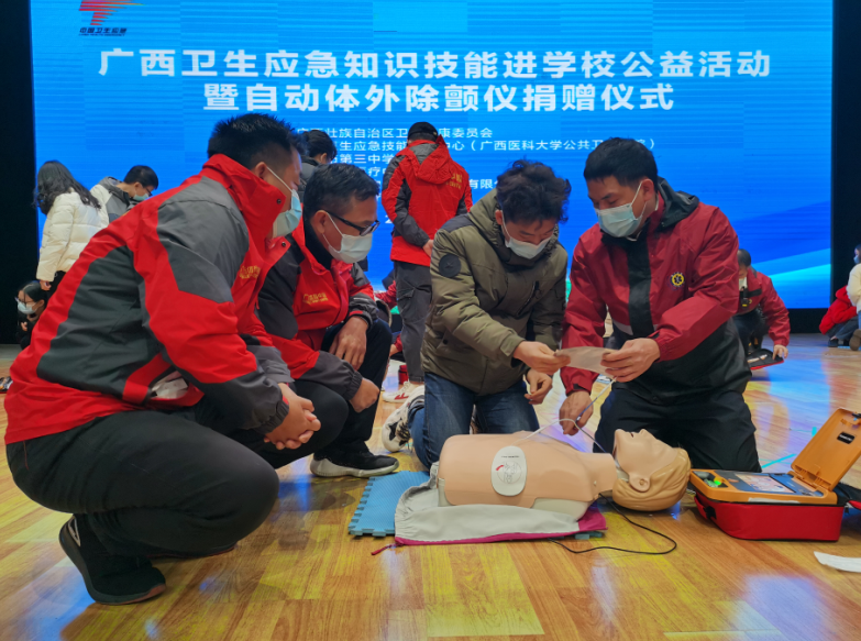 2020年12月16日,自治区卫生健康委联合南宁急救医疗中心举办卫生应急知识技能进学校公益活动暨自动体外除颤仪捐赠仪式,万搏在线(中国)唯一官方网站文体公司副总经理黄庆全带队参加活动,并代表公司受赠自动体外除颤仪(AED)。