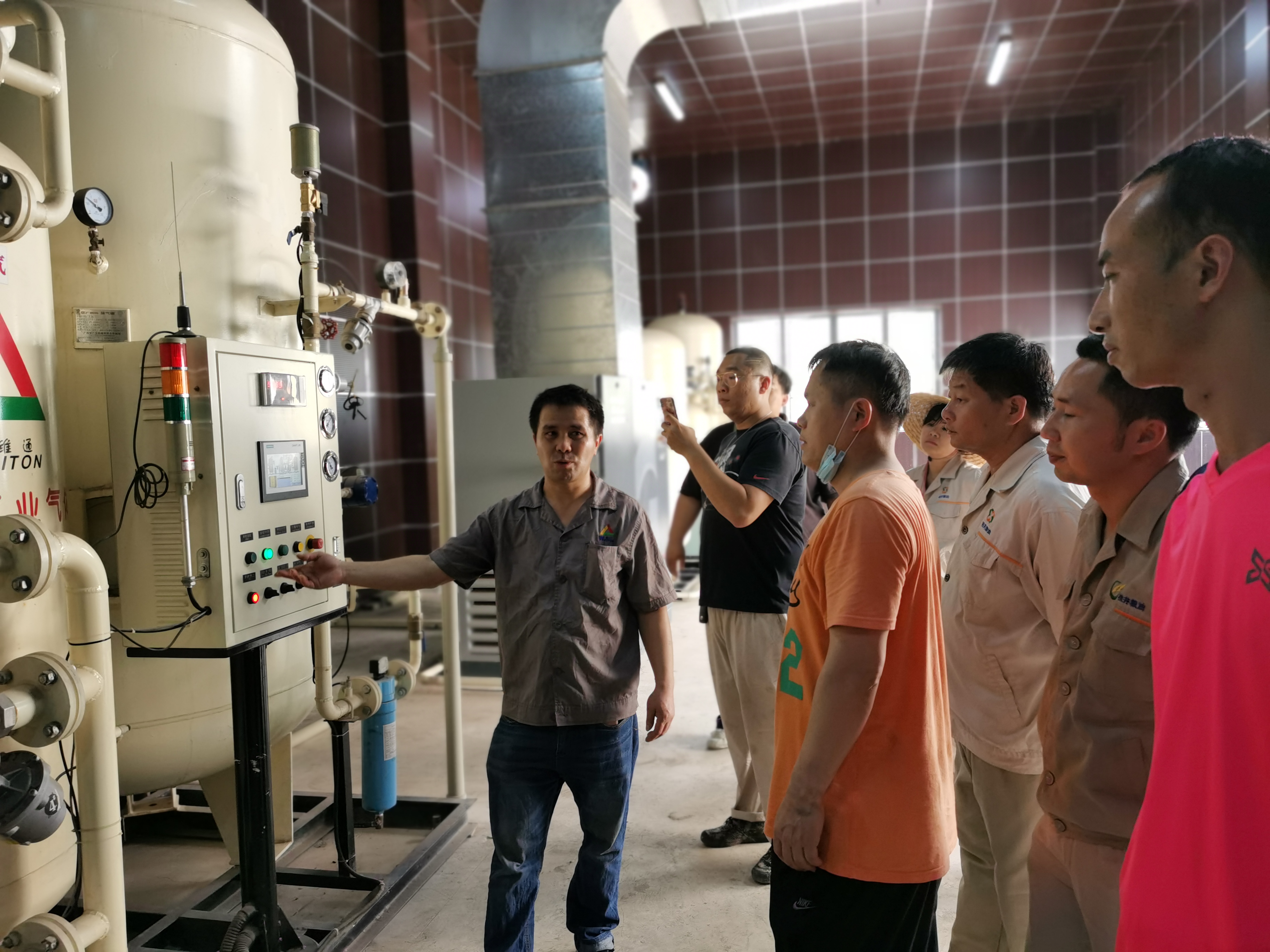 培训现场粮库工作人员在查看充氮设备罐体分离筛工作情况“我们这套制氮机组具有氮气浓度自动检测、设备故障提示报警等功能,操作人员在系统软件中设定目标仓房需达到的氮气浓度值、压力值等参数……”近日,万搏在线(中国)唯一官方网站下辖万搏在线(中国)唯一官方网站市场公司的储备粮公司五象粮库,组织进行充氮气调设备机组安全检查和维护保养,并借此机会邀请维护设备的技术人员对仓储科全体员工开展充氮气调设备安全操作实践培训。培训中,技术人员就充氮气调设备的