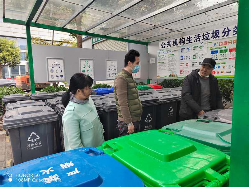 检查现场2022年1月12日上午,公司副总经理李可梅带队到南宁东盟产业研发大厦开展垃圾分类工作实地督导检查。李可梅一行先后查看垃圾分类宣传工作、垃圾桶配备、垃圾分类投放、收集、运输等垃圾分类工作开展情况,并对下一步开展垃圾分类工作提出具体要求。李可梅要求,在下一步工作中,要加大宣传教育力度,全力推动垃圾分类工作扎实开展,通过有效的督促引导,让更多人行动起来,培养垃圾分类的好习惯;要坚持党建引领,从