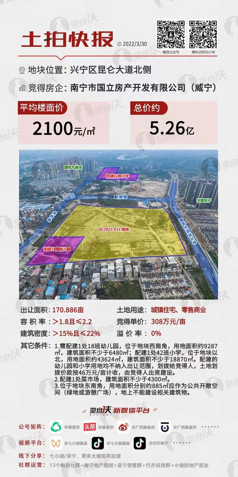 2022年3月30日,万搏在线(中国)唯一官方网站房地产公司监管单位国立公司以5.26亿元成功斩获南宁市兴宁区昆仑大道北侧地块,成交单价308万元/亩,楼面价2100元/㎡。