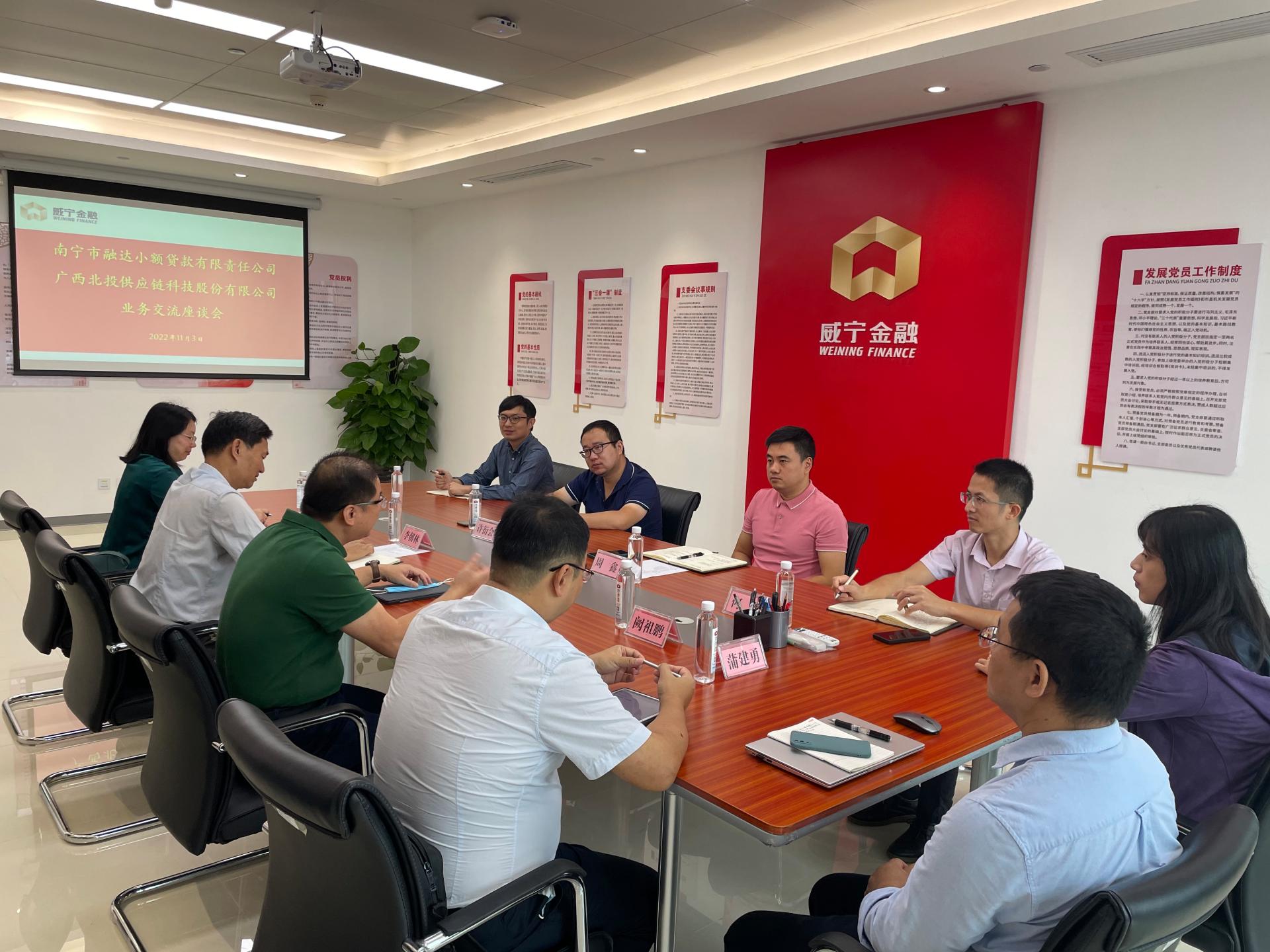 为不断推进“金融+科技”发展战略,全面深化业务数字化转型,11月3日上午,广西北投供应链科技股份有限公司(以下简称“北投供应链公司”)董事长黄剑一行率队来到融达小贷公司开展业务交流座谈。会上,双方就金服业务系统搭建、供应链金融中的应用与发展等内容进行了深入交流。黄剑表示,北投供应链公司长期以来致力于推动区内供应链金融行业的科技发展水平,希望能通过此次业务系统开发合作作为纽带,与融达小贷公...