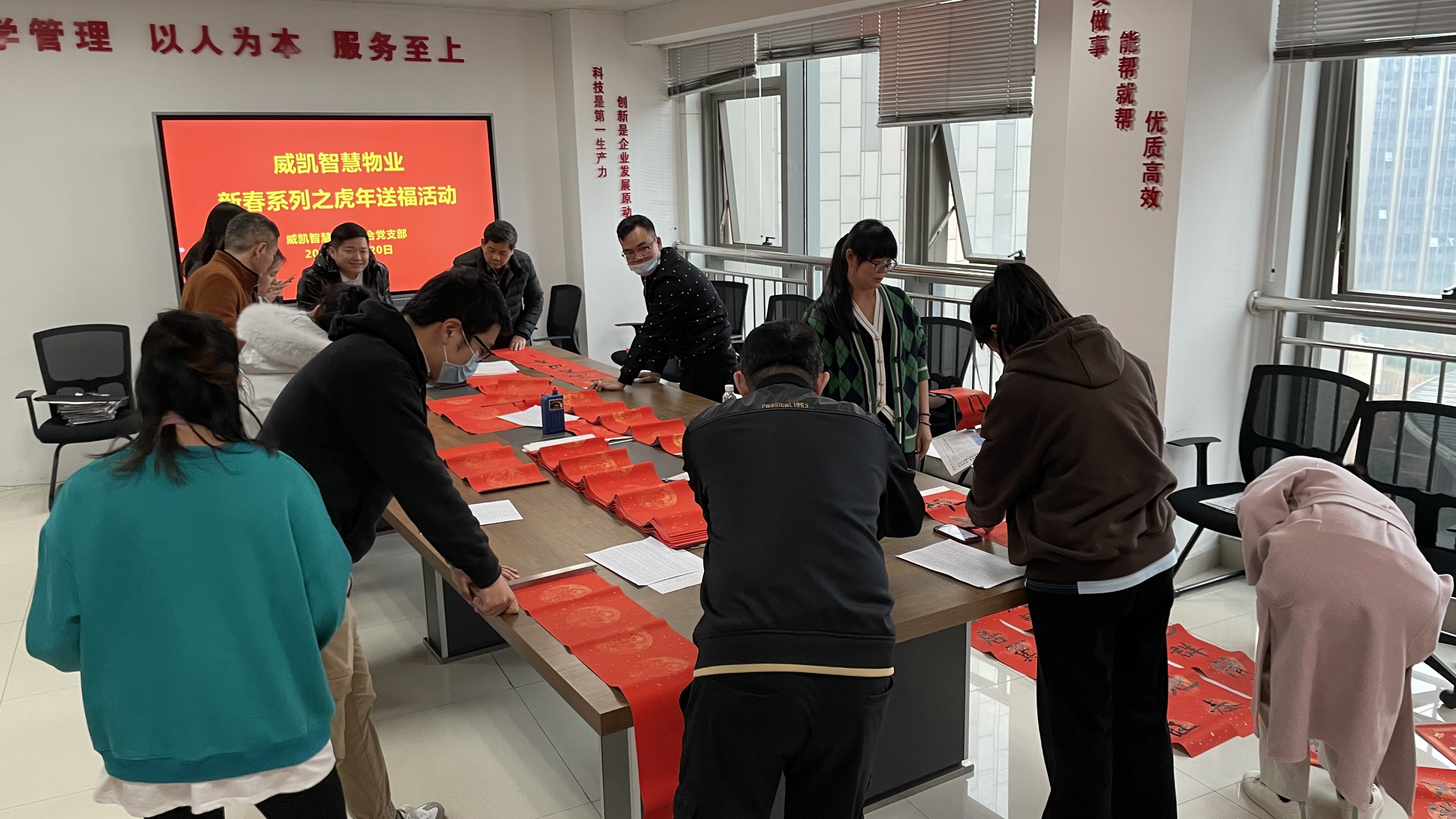 活动现场转眼,距离农历新年的脚步越来越近了。为了弘扬中华传统文化,增添公司新年氛围,2022年1月20日威凯智慧物业公司联合党支部组织了“寅虎迎春 墨香送福”写春联送福主题党日活动。活动组织了公司党员职工、家属现场书写春联,为即将来临的春节增添了浓浓的喜庆氛围。活动现场,书法“达人”们手持文房四宝,挥毫泼墨,热情洋溢地写下一副副春联和一张张“福”字,一笔一画遒劲有力,一字一句增添吉祥瑞气,其他党员