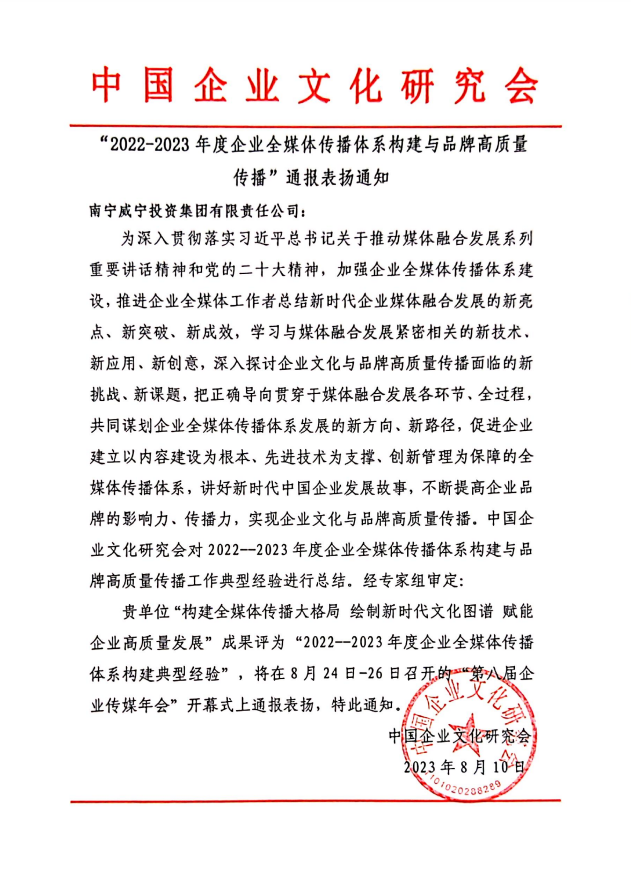中国企业文化研究会于2023年8月24日-26日在山东省泰安市举办“加强全媒体传播体系建设,实现品牌高质量传播---第八届企业传媒年会”。万搏在线(中国)唯一官方网站《 构建全媒体传播大格局 绘制新时代文化图谱 赋能企业高质量发展》成果被评为“2022-2023年度企业全媒体传播体系构建典型经验”并在会上通报表扬。据了解,面对舆论生态、媒体格局、传播技术的深度变革,万搏在线(中国)唯一官方网站通过借助“全程媒体、全息媒体、全员媒体、全效媒体...